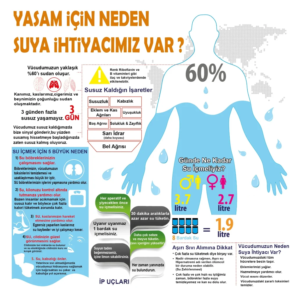 Günlük su ihtiyacı ve hedefi Yaş, kilo, aktivite, iklim ve sağlık durumuna bağlı olarak değişir; yetişkinler için genelde yaklaşık 2-3 litre önerilir; kilo başına 0,033 x kilo formülü yaklaşık litreyi verir; çorba, süt, meyve-suları gibi diğer sıvılar da hesaba katılır.